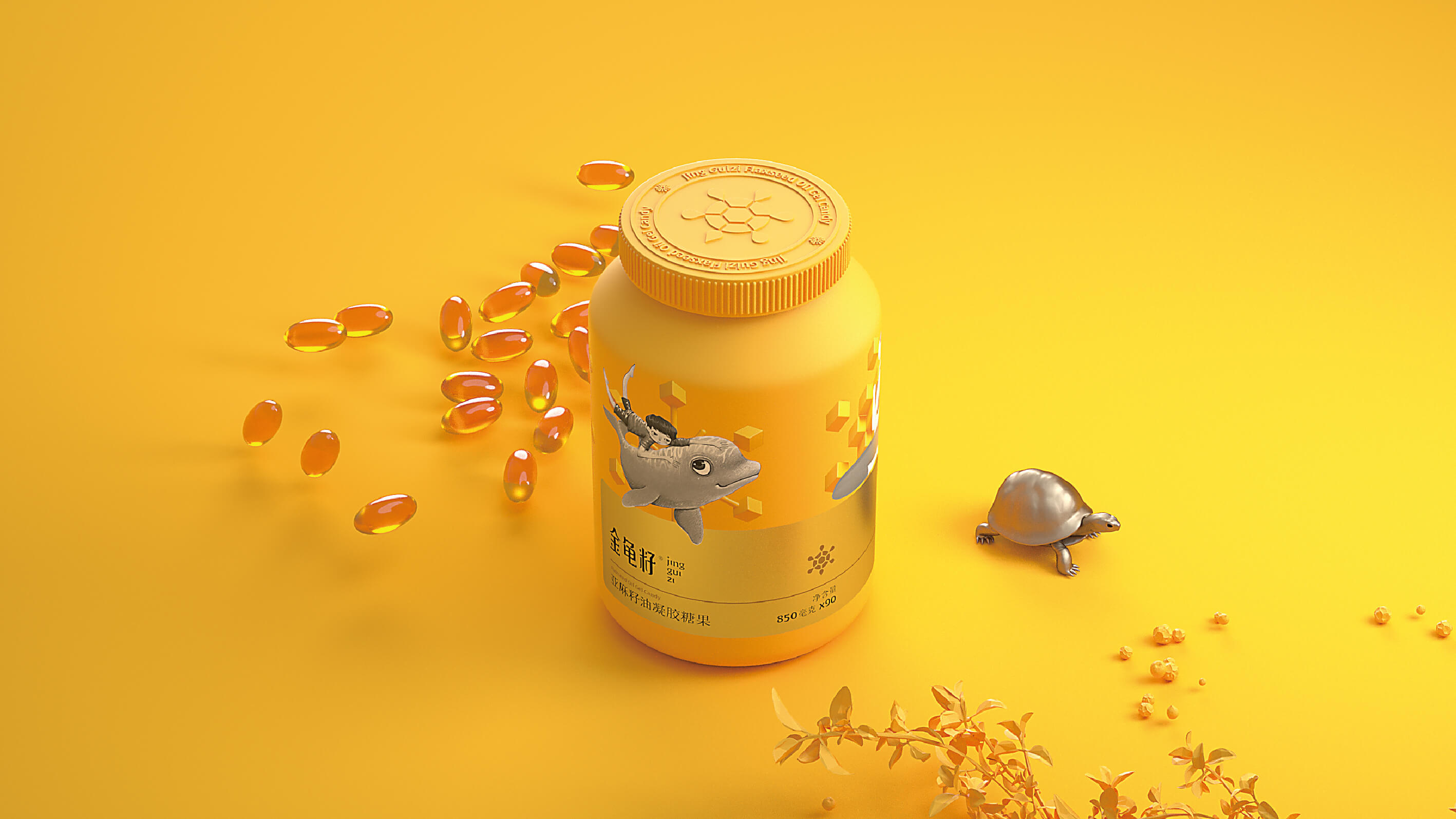 从品牌命名上,就已经体现出塑造品牌认知的视觉指引。金,代表品质、珍贵、稀有,同时也是高品质亚麻籽油的物理色彩;龟,长寿的象征,体现出亚麻籽油的品类定位,与产品功能核心价值相符。塑造简约时尚的金龟IP,将其独特的龟壳六边形作为品牌纹样,应用于整个产品包装体系,保持品牌认知的一致性。 -